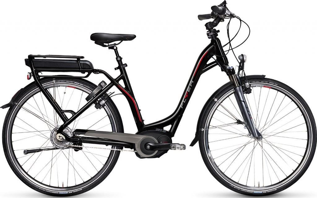 Voilà un très beau vélo électrique rapide à cadre bas ! Il n'y en a pas beaucoup et Flyer est une des rares marques à en proposer. Le moteur Bosch Performance est bien puissant et vous emmène au moins jusqu'à 40 km/h, après, vu la position très confortable, il faudra appuyer un peu plus sur les pédales pour aller plus vite ! Les vitesses NuVinci sont parfaites pour ce genre de vélo : facile à changer à l'arrêt et en roulant, et vous permet de rouler vite sans que les pédales tournent trop rapidement.